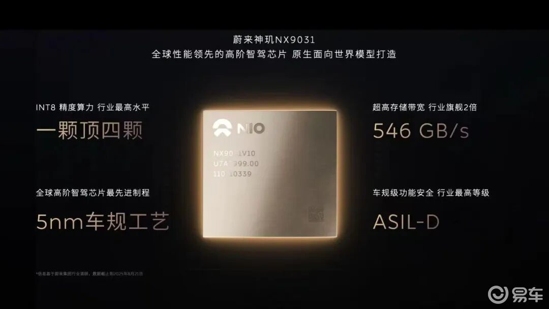 最后,再简单说一下“全球首颗5nm车规级工艺高阶智能辅助驾驶芯片”——「神玑 NX9031」。按照蔚来的说法,该芯片每秒可运行超6万亿条指令,其546GB/s的存储带宽两倍于行业旗舰芯片,算力达“行业最高水平”,可满足5年以上智能辅助驾驶的演进需求。