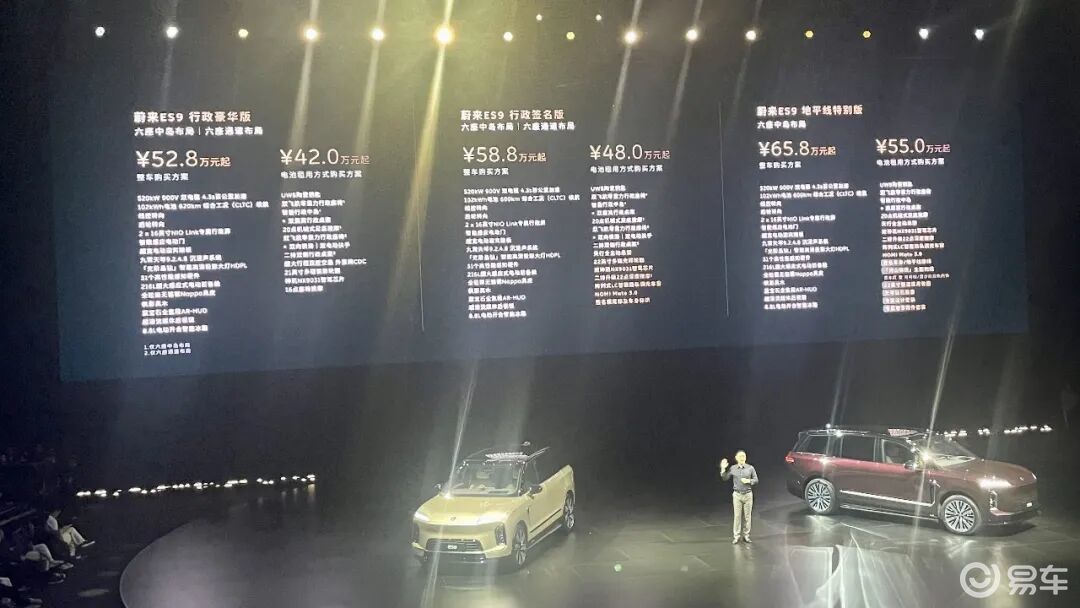 当晚,蔚来ES9共推出三个版本,其整车购买预售价为52.8-65.8万元,电池租用购买预售价则为42-55万元。既然是“产品技术发布”,这次就先重点聊一下该车的产品本身与核心技术。至于其它,则留待ES9正式上市之时。