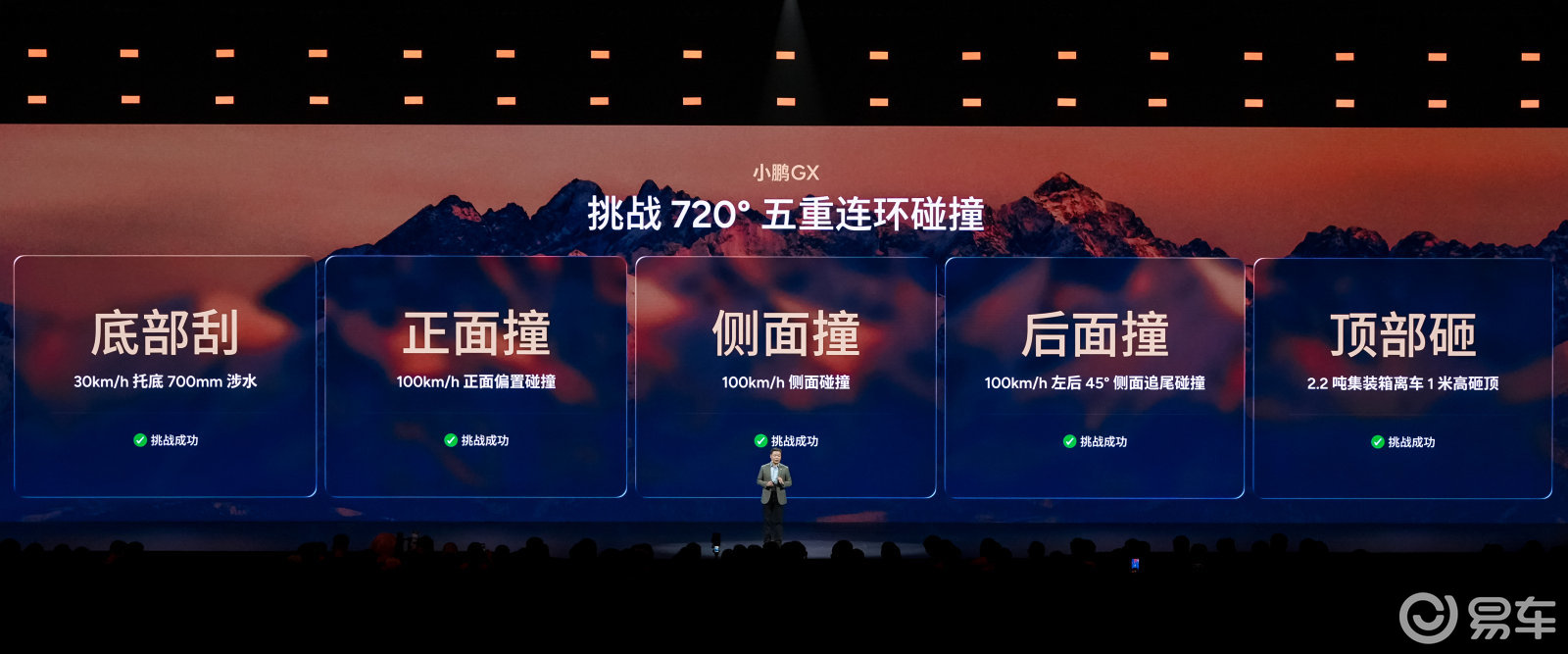 先说安全。小鹏GX这次带来的,不是几个气囊、几项主动刹车的简单叠加,而是一套完整的“三大旗舰安全体系”。被动安全层面,16000T前后一体大压铸、11个安全气囊,构筑了物理层面的坚固堡垒。为了验证这套体系的真实实力,小鹏GX完成了行业首次720°立体五重连环碰撞挑战,以远超国标的极端工况检验整车安全性能,成功通过挑战。此外,主动安全层面,小鹏GX同样针对L4时代的安全问题进行了考量,带来了行业更强的AI智能主动安全组合,AI智能底盘融合运动控制系统(X-VMC)以及驾驶员失能辅助系统。X-VMC智能融合系统在抛光冰面、冰雪稳行控制、弯道爆胎稳行以及动态驾乘等场景,能带来极致安全、极致舒适、极致操控的驾乘体验。同时,小鹏GX还实现150km/h行业最高AEB刹停速度、130km/h行业最高AES避让速度,同时支持冰雪湿滑低附路面AES功能,提前预判并规避各类行车险情。