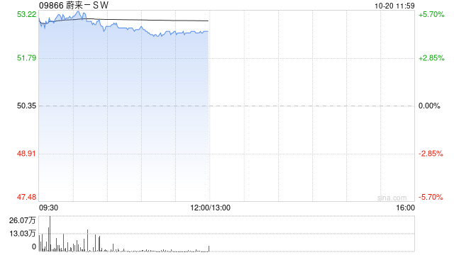 蔚来-SW(09866)盘中涨超5%,截至发稿,股价上涨4.37%,现报52.55港元,成成交额1.65亿港元。