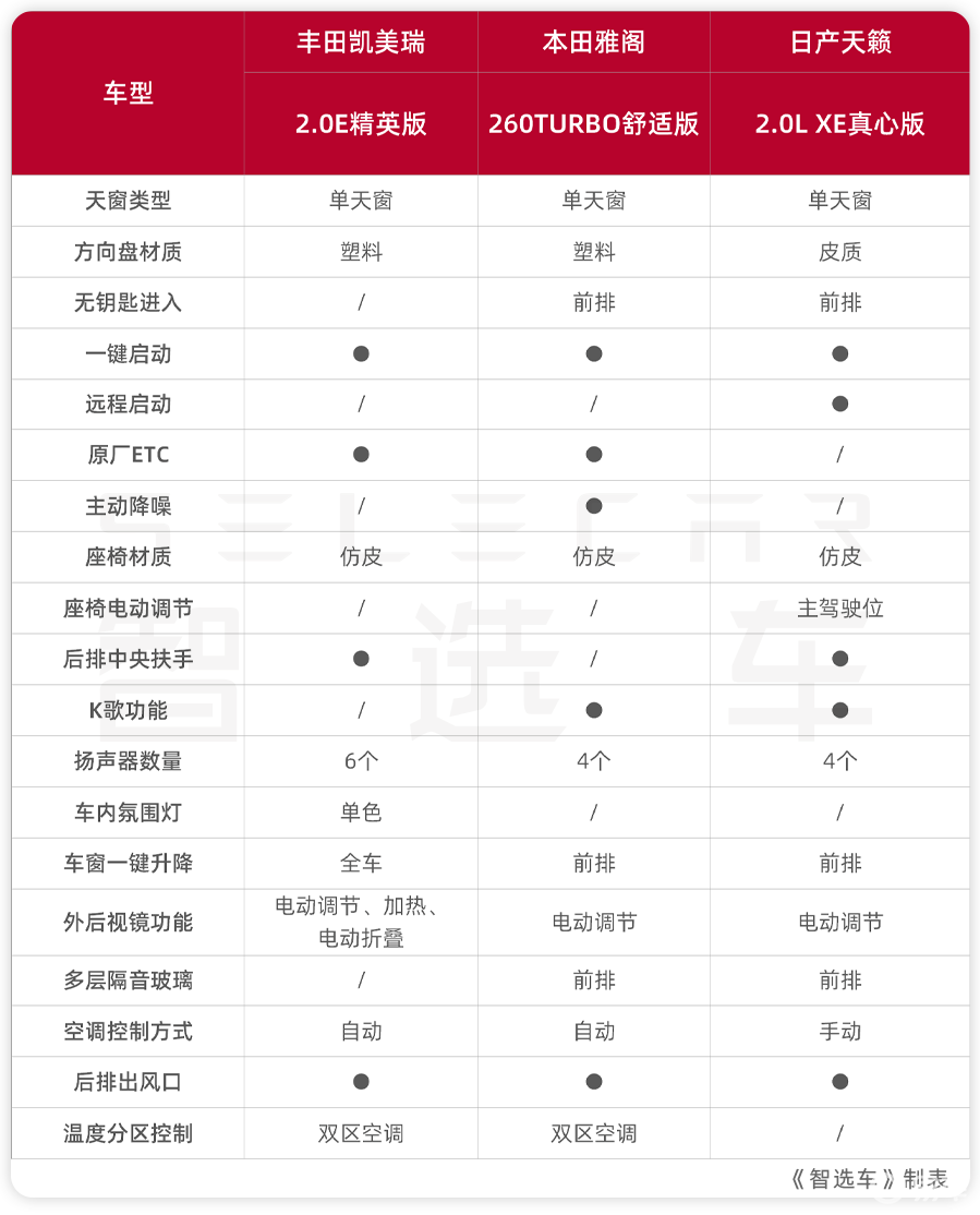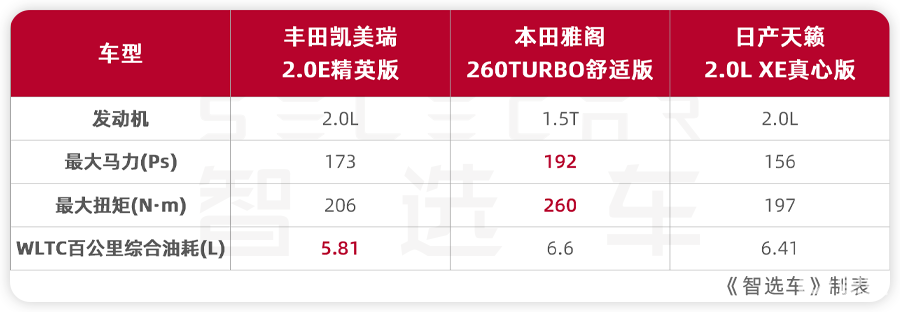 所以还是那个老生常谈的话题,如果想买台合资B级车,“日系三剑客”应该怎么选?今天我们就拿凯美瑞2.0E精英版、雅阁260TURBO舒适版、天籁2.0L XE真心版,这三款车的入门版本,看看作为家用车的话,到底谁更贴合需求?