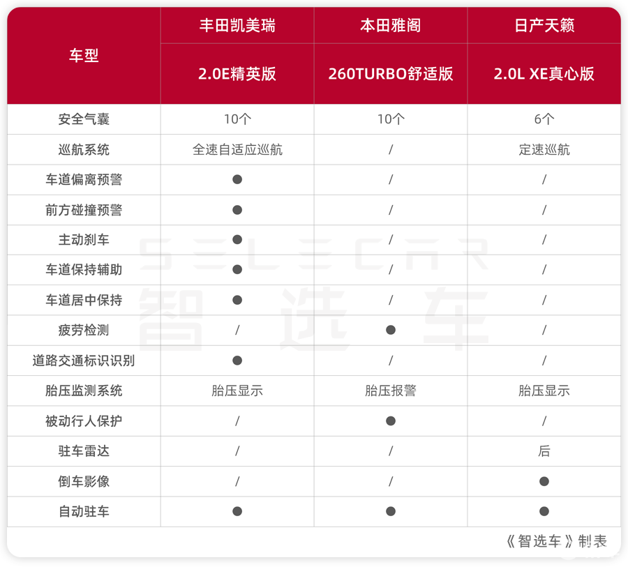 雅阁同样全系标配10个安全气囊,和凯美瑞不同的是,虽然少了前排中央安全气囊,但多了副驾驶膝部气囊。不过,身为入门车型的舒适版,主动安全功能不如凯美瑞全面,只有疲劳检测、被动行人保护功能。此外,和凯美瑞一样,都没有倒车影像,买完之后可能需要花个几百块钱加装一下。
