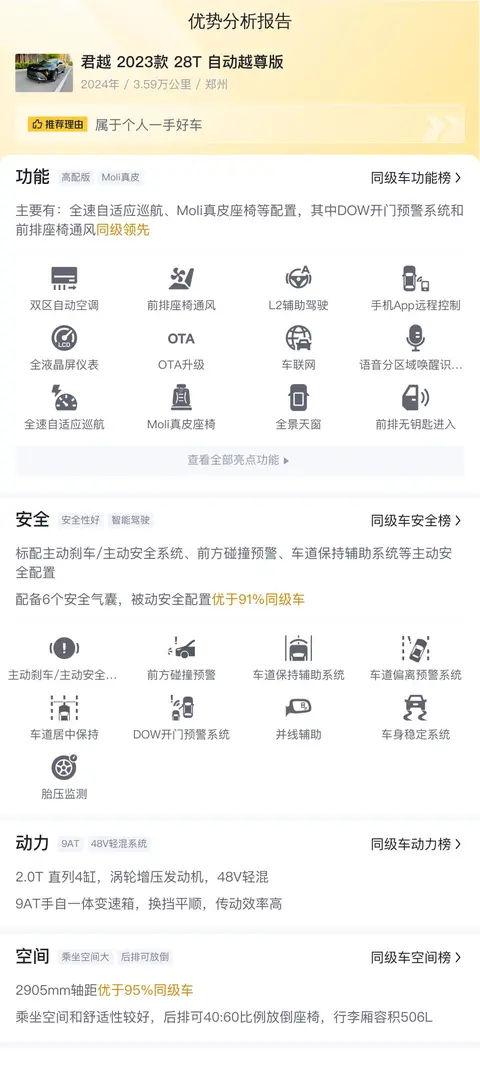 君越2023款28T自动越尊版在众多同级别车型中,展现出了独特的竞争优势。首先,其先进的动力系统,尤其是在WLTC标准下的综合油耗仅为6.59L/100km,这一数据相较于同级别车型而言,表现出了显著的燃油经济性优势。这意味着在日常使用中,君越28T自动越尊版能够为车主节省更多的燃油成本,从长期来看,这无疑是一个重要的考量因素。其次,君越28T自动越尊版在配置上也展现出了不俗的竞争实力。无论是驾驶辅助系统,还是舒适配置,它都能为乘客提供优质的驾乘体验。特别是在座椅配置上,如加热、通风和按摩功能,这些都是同级别车型中并不常见的高端配置,它们不仅提升了乘坐的舒适性,也彰显了车主的品味和地位。然而,君越28T自动越尊版也并非完美无缺。在某些方面,它仍然存在一些可以改进的空间。例如,虽然其综合油耗表现优秀,但在动力输出方面,与某些高性能车型相比,君越28T自动越尊版可能显得相对中规中矩,对于追求极致驾驶体验的消费者来说,这可能不是一个理想的选择。另外,也有部分消费者反映,君越28T自动越尊版的内饰材料选择上,塑料感较为明显,这在一定程度上影响了整体的豪华感和质感。相比之下,一些竞品车型在内饰用料上可能更加讲究,为乘客提供了更加奢华的乘坐环境。最后,考虑到别克品牌的市场保值率并不算高,这也可能会影响到君越28T自动越尊版的二手市场价格表现。如果车主计划在购买后不久就出售车辆,那么这一点也需要纳入购买决策的考量之中。