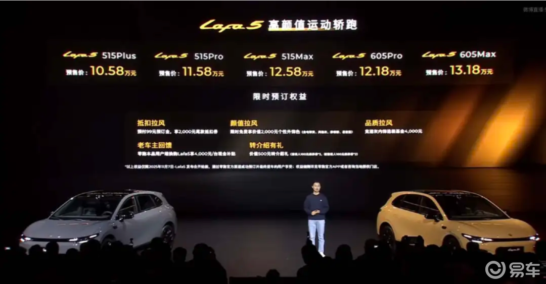 在续航方面,Lafa5提供515km和605km两种选择,并支持800V高压快充技术,0%-80%充电仅需18分钟。