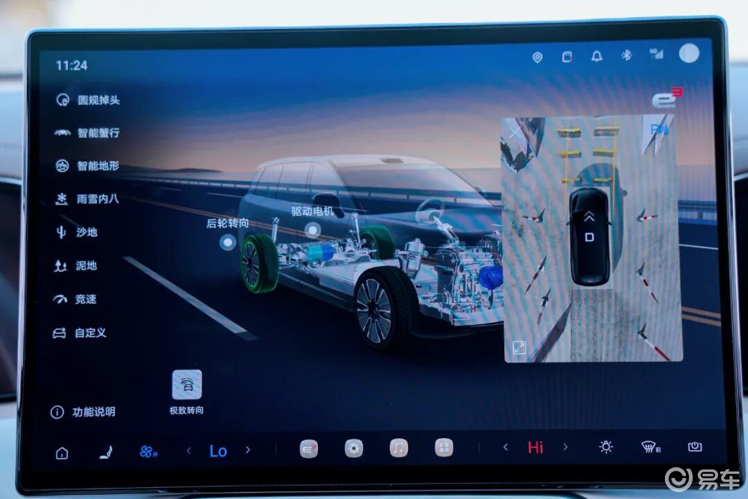 在侧方停车时,车身可以直接 “平移” 入库。在泊车场景的试驾中,驾驶N8L斜向开进车位,此时虽然车头已经在车位内,但车尾还在车位外,由于后轴的两个电机可以独立、精确地控制左右后轮的扭矩输出,此时系统会控制前后轮朝向相同的方向偏转(例如都向左或都向右),这样车辆就可以产生横向的推力,以车头为圆心后车轮实现类似圆规轨迹横移入库。