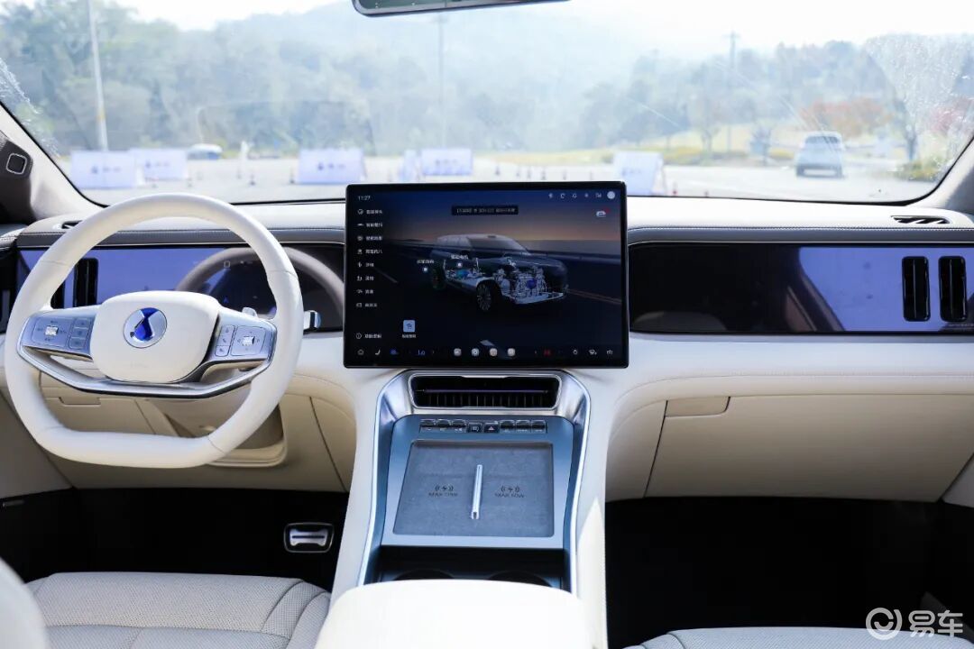 对称式中控台布局清晰明了,功能分区合理。13.2英寸全液晶仪表、17.3英寸2.5K悬浮中控屏和13.2英寸副驾娱乐屏,组成了车内的 “黄金三角”,三块屏幕的清晰度和色彩还原度极高,显示效果细腻。当开启语音控制时,喊一声 “你好腾势,导航去新街口”,中控屏上规划好的路线便会同步投射到仪表屏上,驾驶安全性大大提高;副驾的家人也能在娱乐屏上刷剧、听歌,互不干扰。