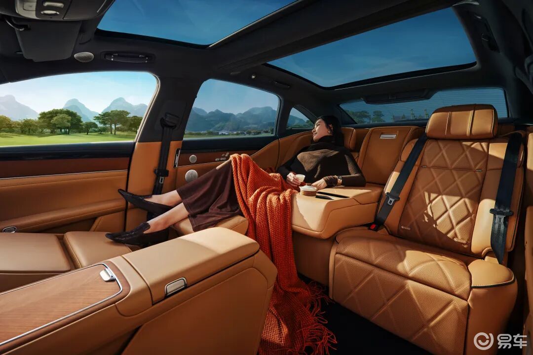 内饰是两车舒适性比拼的核心战场。岚图追光L秉承“山海同光”理念,营造出简洁而高级的东方禅意座舱。T字形中控布局简约大气,配备16.1英寸3K HDR悬浮中控屏与10.25英寸仪表屏,辅以256色氛围灯及智能美妆镜。座椅是其一大亮点:豪华云朵座椅采用10层人体工学结构+35mm快慢回弹海绵,全系标配前后排加热、通风与10点SPA按摩功能;主驾支持14向电动调节与记忆、腿托延伸,副驾则为真零重力座椅,可一键实现超宽角度舒躺。此外,该车还配备1.21㎡双段全景天幕、四温区空调、6.6L宽温域智能冷暖冰箱以及VOYAH Sound 7.1.4全景声音响系统,共同打造出静谧奢华的移动私享空间。