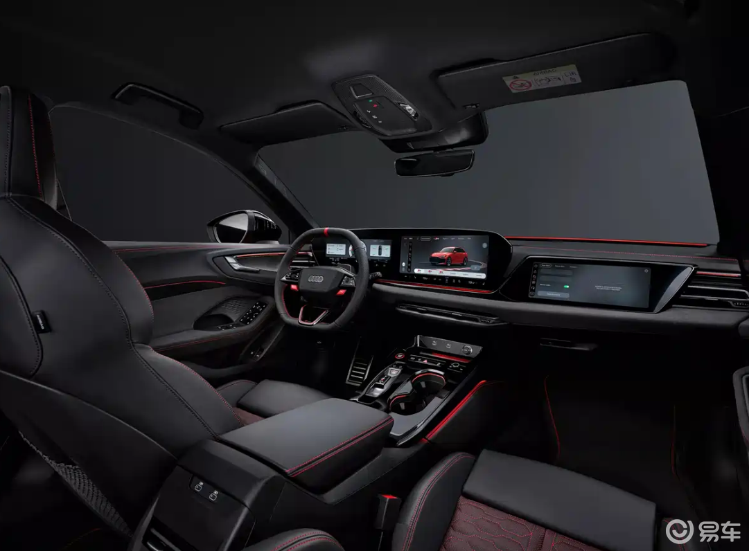 内饰上,新车采用了和A5一样的布局方式,采用连体悬浮大屏,副驾驶的一侧还有一块大屏,整个中控台上有个性化的缝线,方向盘上有标志性的红色装饰,并且还有红色的换挡拨片,此外,它的内部氛围灯很丰富,座椅上方有红色的织线,整体看起来十分的凶悍。在动力方面,新车搭载的是2.9T的双涡轮增压发动机和电动机组成的插电混合动力系统,发动机最大输出功率为510马力,最大扭矩600牛·米;电动机最大功率177马力,最大扭矩460牛·米;因此,它的系统综功率达到了639马力,综合扭矩825牛·米,0-100km/h加速3.6秒,纯电续航80公里。