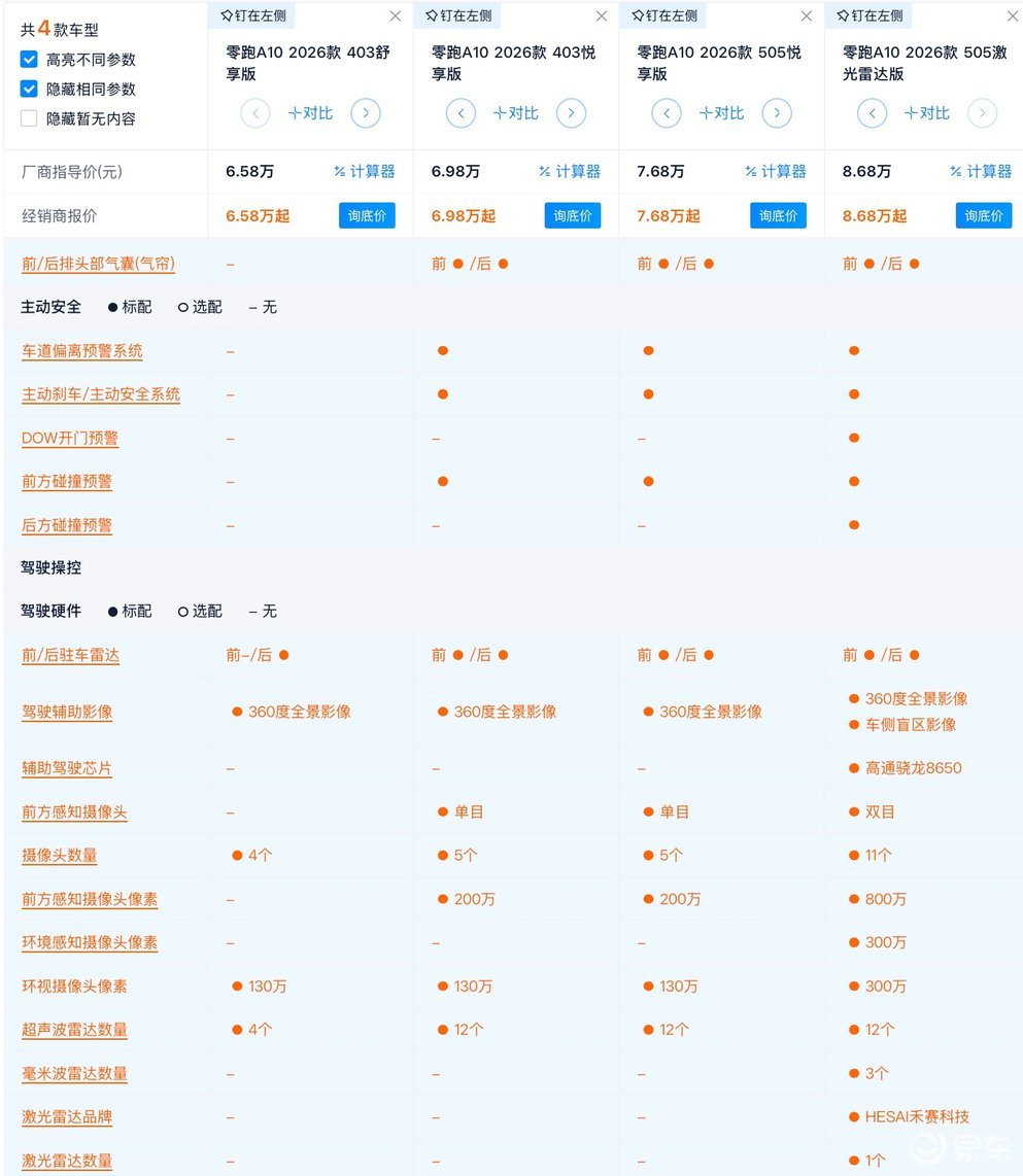 零跑A10定位入门级代步纯电SUV,日常基础能耗成本确实具备优势,但是用车成本背后的隐性支出,也不可忽视。就比如激光雷达。