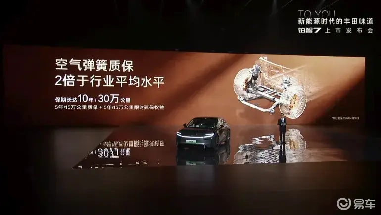同样的承诺也体现在双腔空悬的质保上,目前行业普遍提供5年/15万公里质保;在此基础上,广汽丰田限时追加了5年/15万公里质保权益。叠加之后,铂智7的空悬质保期长达10年/30万公里,是行业平均水平的两倍!