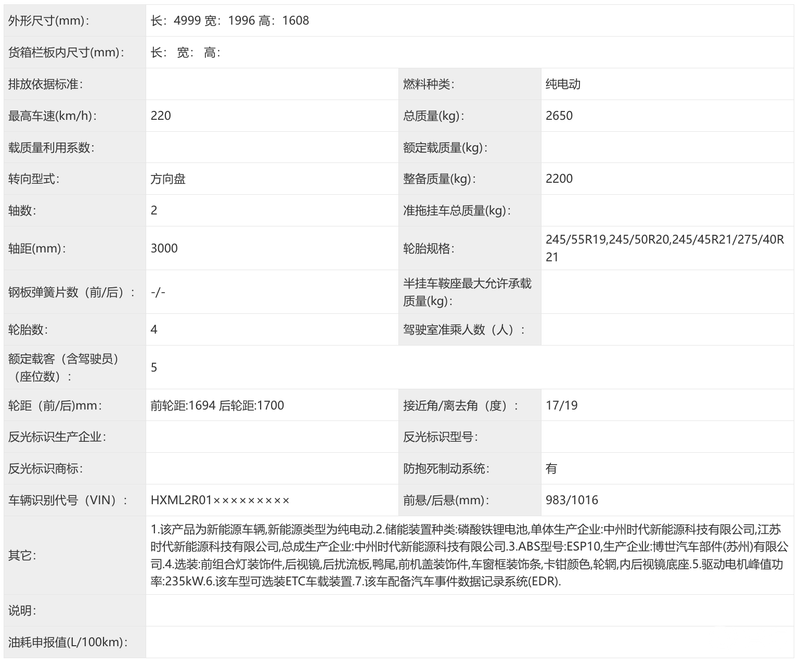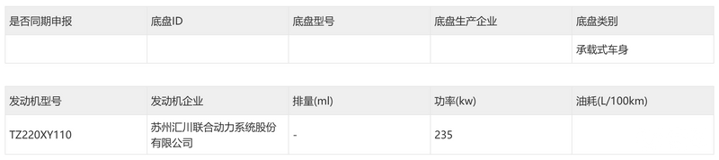 动力方面,新车采用后置单电机布局,峰值功率235kW,电机型号TZ220XY110,由苏州汇川联合动力系统股份有限公司提供。