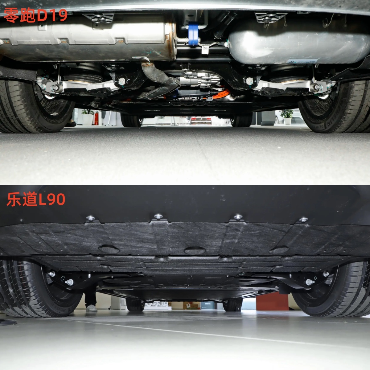 L90:乐道L90采用前双叉臂式独立悬挂和后多连杆式独立悬挂,相比D19悬挂铝合金材质较少,L90同样提供空气悬挂,并且支持软硬+高低可调节,但是采用单腔结构,反观零跑D19采用双腔结构,悬挂方面的用料更扎实一些。