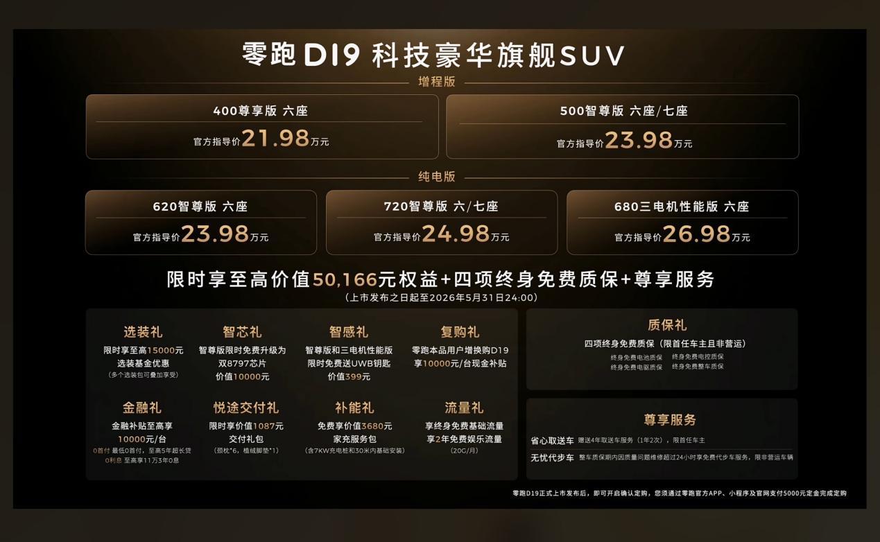 写在最后,随着新能源SUV的竞争达到了白热化,可以选择的车型也是百花齐放,D19和L90也是各有特点,D19延续了零跑品牌一直以来造车的优点,品价比比较高,车辆的产品力也是相当成熟,完善,你想到的它都有,想不到的它也都有,标配及满配,混动大电池纯电续航达到了500公里,可以媲美一些同级纯电SUV,长途出行还可油可电,不必为续航和补能焦虑,配置和各方面不输30-40万元的车型,最近上市权益也很有诚意,限时享价值50166元权益+四项终身免费质保等,如果感兴趣,建议可以去门店咨询、试驾看看。