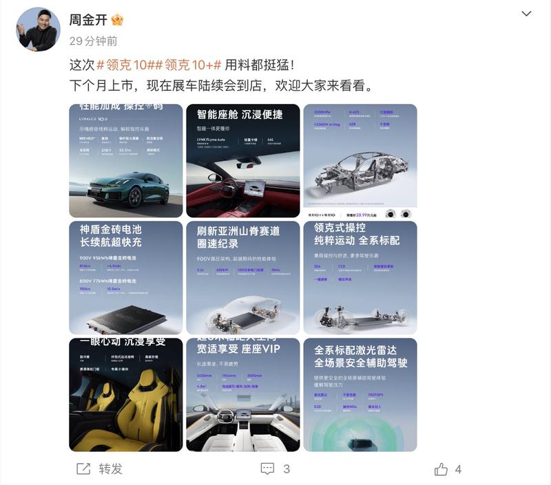 车讯 4月27日,领克汽车销售公司常务副总经理周钘在社交媒体上表示,领克10和领克10+将于5月正式上市。该车已经在4月24日北京车展上开启预售,预售价20.99万元起。